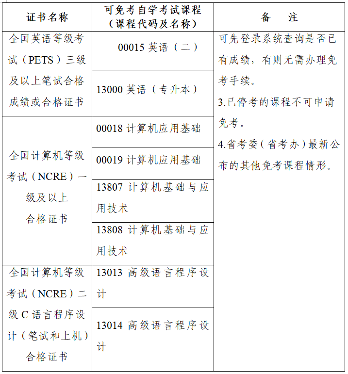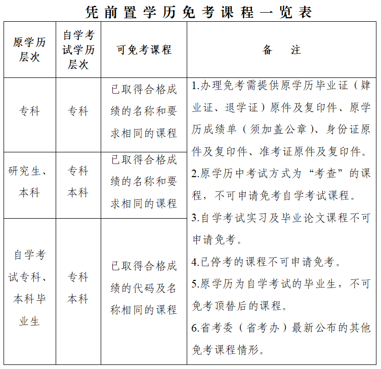 發(fā)表時(shí)間:2025-12-06 09:24 根據(jù)《高等教育自學(xué)考試暫行條例》《廣東省自學(xué)考試實(shí)施細(xì)則》有關(guān)規(guī)定和教育部相關(guān)文件要求,制定本規(guī)定,自2026年起實(shí)施。 一、憑前置學(xué)歷申請(qǐng)免考課程 (一)前置學(xué)歷范圍 國(guó)家承認(rèn)學(xué)歷的各類高等學(xué)校及自學(xué)考試專科以上(含專科)的畢業(yè)生(肄業(yè)生、退學(xué)生)報(bào)考自學(xué)考試,可按有關(guān)規(guī)定申請(qǐng)免考已學(xué)過并考試成績(jī)合格的有關(guān)課程。本科結(jié)業(yè)可視同專科學(xué)歷,可使用結(jié)業(yè)的合格成績(jī)辦理專科層次課程的免考。 (二)可免考自學(xué)考試課程 考生可憑上述前置學(xué)歷申請(qǐng)免考的自學(xué)考試課程如下: ![]() (三)辦理步驟 1.考生登錄廣東省自學(xué)考試管理系統(tǒng)(以下稱“系統(tǒng)”)提交免考申請(qǐng)后,向縣(區(qū))考辦提交身份證、畢業(yè)證書和完整成績(jī)表的原件及復(fù)印件。成績(jī)表須加蓋原畢業(yè)學(xué)校教務(wù)處公章,其中自學(xué)考試成績(jī)表由省級(jí)高等教育自學(xué)考試機(jī)構(gòu)加蓋公章。如成績(jī)表是從本人檔案中復(fù)印的,檔案所在單位人事部門須在復(fù)印件上簽署意見,并加蓋公章。 2.肄業(yè)生、退學(xué)生須到當(dāng)?shù)厥锌嫁k現(xiàn)場(chǎng)辦理免考申請(qǐng)手續(xù)。 3.縣(區(qū))考辦收集、驗(yàn)核考生材料,證件原件即退回考生,并打印免考辦理憑證交考生,整理考生材料后統(tǒng)一報(bào)市考辦。 4.市考辦審核考生材料后,在復(fù)印件上簽署意見并加蓋公章,同時(shí)打印《免考審核表》,與復(fù)印件材料一并上報(bào)省考辦。 5.省考辦審核后,審核結(jié)果上傳系統(tǒng),不書面反饋,市考辦、考生可通過系統(tǒng)查詢審核結(jié)果。 二、憑證書申請(qǐng)免考課程 (一)證書范圍 根據(jù)有關(guān)規(guī)定,目前可申請(qǐng)免考自學(xué)考試課程的證書包括學(xué)歷證書和全國(guó)計(jì)算機(jī)等級(jí)考試(NCRE)、全國(guó)英語(yǔ)等級(jí)考試(PETS)、大學(xué)英語(yǔ)四六級(jí)考試(CET)的相關(guān)等級(jí)證書。 (二)可免考自學(xué)考試課程 考生可憑上述證書申請(qǐng)免考的自學(xué)考試課程如下: ![]() ![]() (三)辦理步驟 1.考生登錄系統(tǒng)提交免考申請(qǐng)后,由系統(tǒng)自動(dòng)對(duì)證書進(jìn)行初步查驗(yàn),如查驗(yàn)通過則無(wú)需考生提供證書等相關(guān)材料,也無(wú)需經(jīng)市考辦初審,直接進(jìn)入省考辦審核環(huán)節(jié);如查驗(yàn)不通過,則考生須按規(guī)定到市考辦提交身份證、等級(jí)證書原件(核驗(yàn)后即退還)及復(fù)印件,經(jīng)市考辦初審后再提交省考辦審核。 2.省考辦審核后,審核結(jié)果上傳系統(tǒng),不書面反饋,市考辦、考生可通過系統(tǒng)查詢審核結(jié)果。 三、時(shí)間安排 考生向市考辦提交免考材料后,可在30個(gè)工作日后(從市考辦審核通過之日開始計(jì)算)登錄系統(tǒng)查詢審核結(jié)果。憑在外省或2005年前考取的等級(jí)證書辦理免考手續(xù)的,視查驗(yàn)證書實(shí)際所需時(shí)間順延。 |